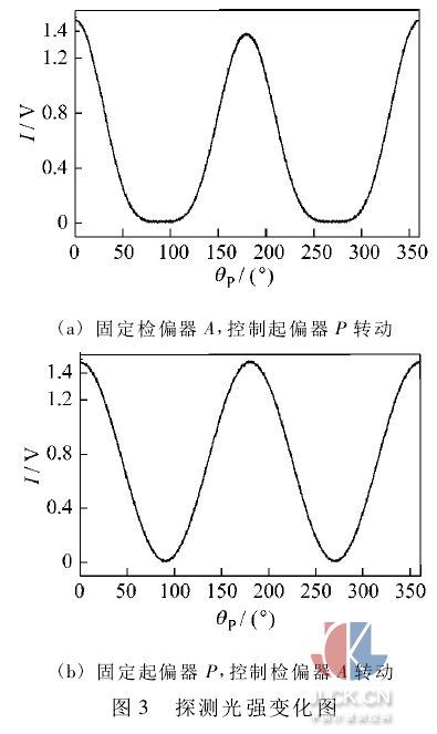 在实验系统中,探测器暗电流对直流信号产生影响,因此单一旋转起偏器或检偏器的椭偏仪在测量过程中需对直流信号做特殊处理。由式(23)、(24)可知,RAP型的椭偏仪可克服该困难,测量椭偏参数和不需要测量光强信号的直流分量,只要测量交流分量即可,提高了系统测量的精度。同时,式(23)和(24)均可计算出椭偏参数,可用于系统自洽检验。实测数据表明本实验系统在可见光范围内其自洽性优于1%。 4实验应用 (1)马吕斯定律验证实验。对于反射式RAP型椭偏仪,其测量的核心手段是旋转检偏器并记录反射光光强随检偏器转动角度变化的规律,并由此计算反射光的偏振状态。为了让学生对此有直观的认识,首先设计一项准备实验。探测光不经样品反射,仅旋转起偏器或检偏器,观察光强变化形式并验证马吕斯定律。 根据马吕斯定律,如果线偏振光的振动面与起偏器(或检偏器)的方位角(即透光方向)的夹角为θ时,其强度为I0的线偏振光通过起偏器(或检偏器)后光强为:I = I0cos2θ。由实验控制程序发出命令,控制起偏器P与检偏器A分别单独旋转,收集探测器接收到的光电压,记录光强随探测光振动面与偏振片方位角夹角的变化。实验结果如图3所示。