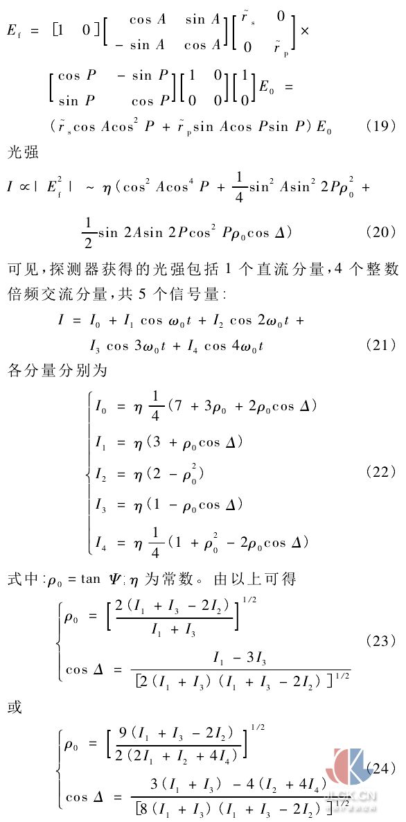 1引言 椭圆偏振(简称椭偏)光谱测量是一种非接触、非破坏性的光学分析技术,是研究材料光学性质的重要手段[1]。椭偏光谱测量技术自问世以来已有100多年历史,1887年,Drude发现光与物质相互作用将导致光的偏振态发生改变,偏振态在相互作用前后所发生的变化与物质的属性、厚度和结构有关。Drude以此提出了椭圆偏振光测量的理论并建立了第1套实验装置,测量了18种金属的光学常数。随后,椭偏测量研究一直陷于停滞,直到Tronstad将其应用于电化学的研究中,椭偏测量所具有的高精确度与非破坏性的优点才得以重视并广泛地应用在各个研究领域中。自从1945年Rothen首次提出Ellipsometry (椭偏),将此测量技术从传统的偏振测量方法独立出来,至今椭偏测量技术已获得极大的发展,不论是测量理论的研究还是测量仪器的研发均取得大量的有价值成果[1-3]。 椭偏测量的基本原理是测量光束经材料反射、透射或散射前后偏振态的改变,由于偏振态的改变与材料的光学性质、厚度、结构直接相关,因此,通过椭偏测量可以获得材料的光学常数。应用最广的是反射式椭偏仪,即测量反射光相对于入射光偏振态的变化,其中依据测量方式又可分为消光式椭偏仪与光度式椭偏仪,消光式椭偏仪以寻找输出最小光强的位置为测量手段,光度式椭偏仪则以测定分析光强的输出变化为测量手段[1-3]。 随着椭偏测量理论的研究与实验技术的发展,现代椭偏仪已获得巨大的技术进步,典型的现代椭偏光谱仪其发展演化主要有如下3个方向[1]: ①测量的光谱范围越来越宽,以满足各种不同材料的测量需求,尤其对于宽禁带的材料,广阔的波长范围才能获得完整的分析数据,同时对于一些特殊材料必须在紫外与红外波段进行测量,因而也出现相应波长范围的专用椭偏仪。②测量的自动化程度越来越高。这主要得益于计算机技术的进步并在椭偏技术中的应用。椭偏仪除被用于研究用途之外,又被大量、广泛地应用于工业生产当中,产量与产能上的需求促使椭偏仪技术向测量自动化、数据分析自动化的方向发展,当今知名的椭偏仪厂商均以自动化与系统集成作为产品研发的重要方向。③测量的速度越来越快,以面阵CCD探测器为主流的多通道探测技术[4]以及并行测试模式[5]使椭偏仪的响应时间越来越短,原来只能对样品进行离位测量的椭偏测量技术发展为可以实时监控的在线测量技术,极大地拓展了该技术在工业应用领域的发展空间。 椭偏测量技术以其高精度、快速、简易以及对测量对象限制少等特点广泛地应用于科研与工业生产当中,其主要应用的领域包括[1,3]: ①材料的光学性质测量。被测的材料可以是固体或是液体,可以是各向同性也可以是各向异性,椭偏测量优点在于不用通过Kramers-Kronig关系而直接获得材料的光学常数与介电函数谱。②界面及表面应用。椭偏测量技术可用于不同材料交界面的分析。③微电子与半导体产业。椭偏测量技术常用于半导体加工或微电子研究中薄膜生长的监控与分析,现代新材料的研究开发也常常使用椭偏技术作为研究手段。④生命科学。椭偏测量技术可用于细胞表面膜相互作用、蛋白质等大分子的测量。 国内科研教学以及工业生产中也有多种型号的椭偏仪获得应用[6],但国内高校目前用于教学的椭偏仪多为单波长消光式,而且自动化程度不高,测量误差较大。本文报道一种反射式同时旋转起偏器和检偏器的动态光度式全自动椭偏仪,并用于实验应用。 2椭偏光谱测量原理 椭偏光谱测量以光波为测量媒介,可以测定任意波长下2个相互独立的椭偏参数,通过对椭偏参数的求解即可获得样品的光学性质,具有非破坏性与非接触的优点。被测的样品可以是固体、液体或者薄膜,可以在大气、真空、高温等多种环境下对样品结构与光学性质进行研究[1,3]。 2. 1材料的光学常数与Kramas-Kronig关系[7] 电磁波在介电常数ε、电导率σ和磁导率μ的各向同性介质中传播,满足Maxwell方程组: