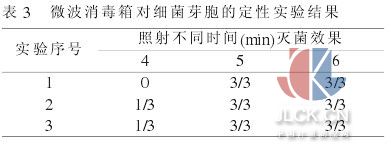 定性实验结果表明, 污染在不锈钢载体上的枯草杆菌黑色变种(ATCC9372) 芽胞, 须经720W 微波照射 5min 以上, 方可达到灭菌效果合格的要求; 照射时间少于 5min, 则不能达到灭菌要求。见表 3。