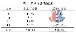 但21-4N冷拉棒材在生产过程中产生的表面裂纹,虽然经过表面磨制,仍有少量表面裂纹未处理掉,裂纹内充满氧化物夹杂,见图2。夹杂性质见电镜扫描数据(表1)。